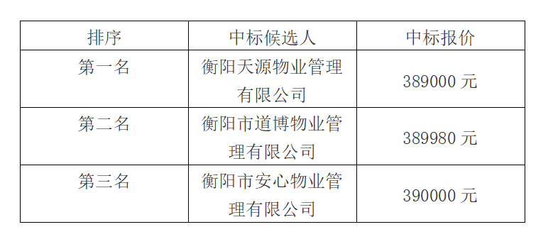 根據招标投标相關法律法規及招标文件的規定 ,衡拖棚戶區改造(一期)安置小區前期物業管理公司比選於2021年11月4日在弘湘寫字樓4樓會議室舉行開标、評标會,本項目採用“低價中标法”,現将中标候選人名單公示如下 :