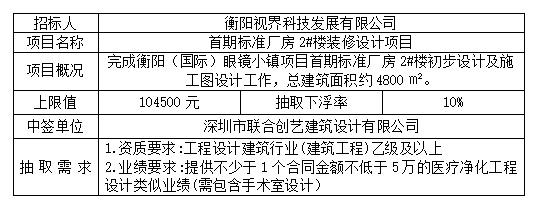 首期标準廠房2#樓裝修設計項目於2025年6月11日在衡陽國投4棟3樓評标室進行瞭随機抽取,現将相關信息予以公示。