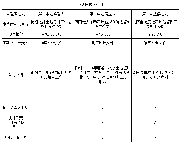 衡陽市植物園片區三宗土地征收成片開發方案編制項目成片開發方案咨詢服務比選於2025年09月25日15時00分在衡陽國投4棟3樓評标室進行瞭比選開标、評标活動,評标委員會按照比選文件及相關法律法規規定進行評審,推薦以下三名中選候選人(排序),現将相關信息予以公示。