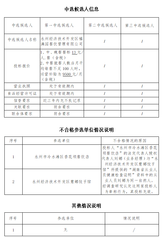湖南長豐獵豹汽車有限公司員工食堂對外承包經營項目(第二次)於2025年9月24日湖南省永州市冷水灘區長豐集團辦公樓二樓評标室、評标活動,評标委員會按照比選文件及相關法律法規規定進行評審,推薦以下中選候選人,現将相關信息予以公示。