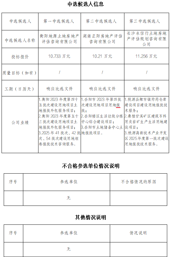 植物園片區80畝地土地組卷報批技術咨詢服務 於2025年12月4日15時00分在衡陽國投4棟3樓評标室進行瞭比選開标、評标活動,評标委員會按照比選文件及相關法律法規規定進行評審,推薦以下三名中選候選人(排序),現将相關信息予以公示。